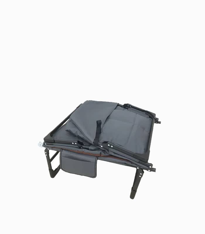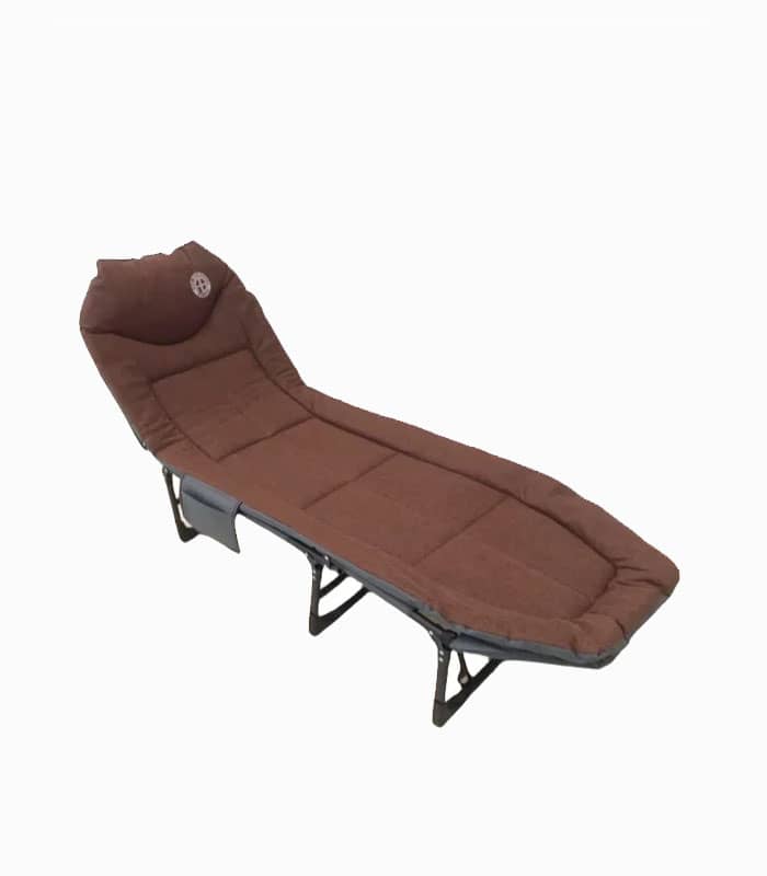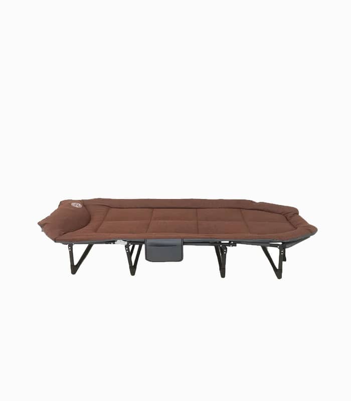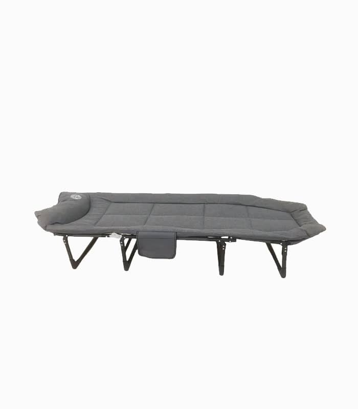 تخت تاشو کمپینگ با بالشت و جیبهای جانبی، سبک و قابل حمل. مناسب کمپینگ، پیادهروی و استراحت کوتاه در محیطهای باز و بسته.