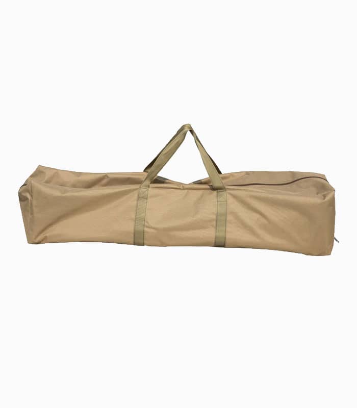 دیوار ضدباد صحرایی تاشو از جنس پارچه دولایه مقاوم، قابل استفاده در کمپینگ، حیاط و باغ. نصب آسان، همراه با کیف حمل و میخهای ثابتکننده.