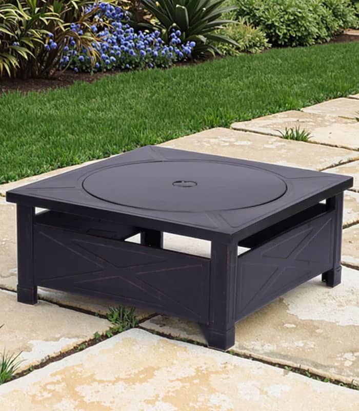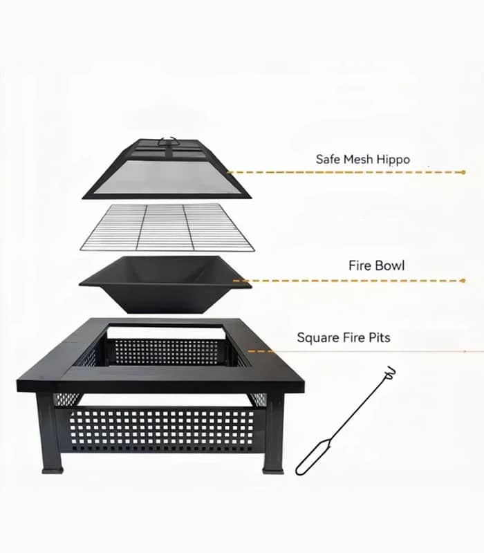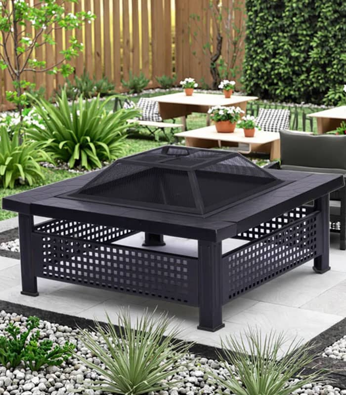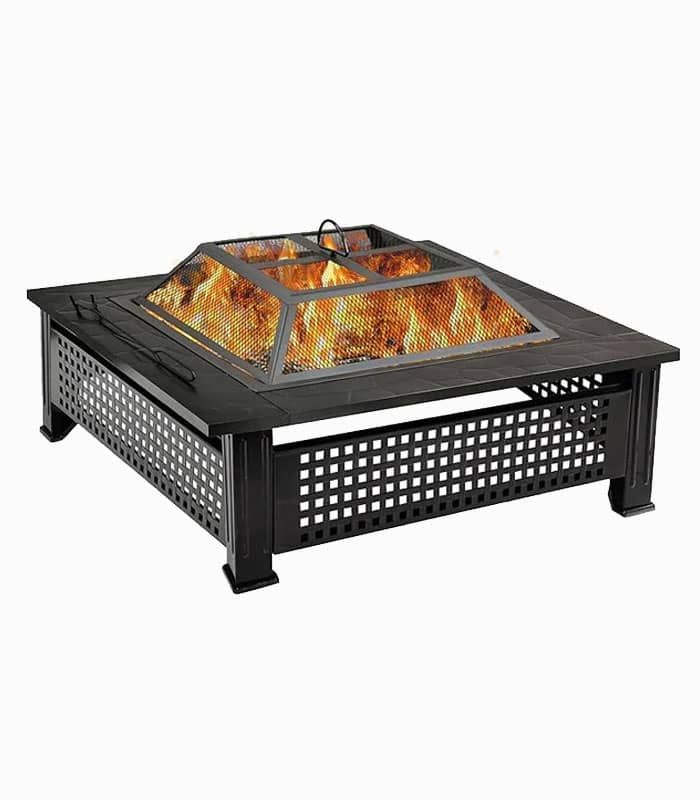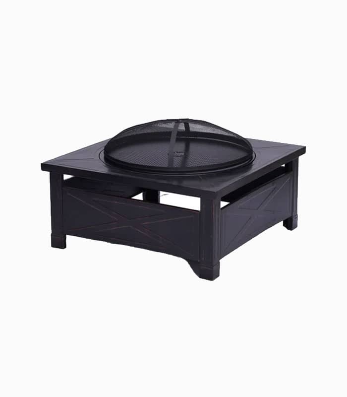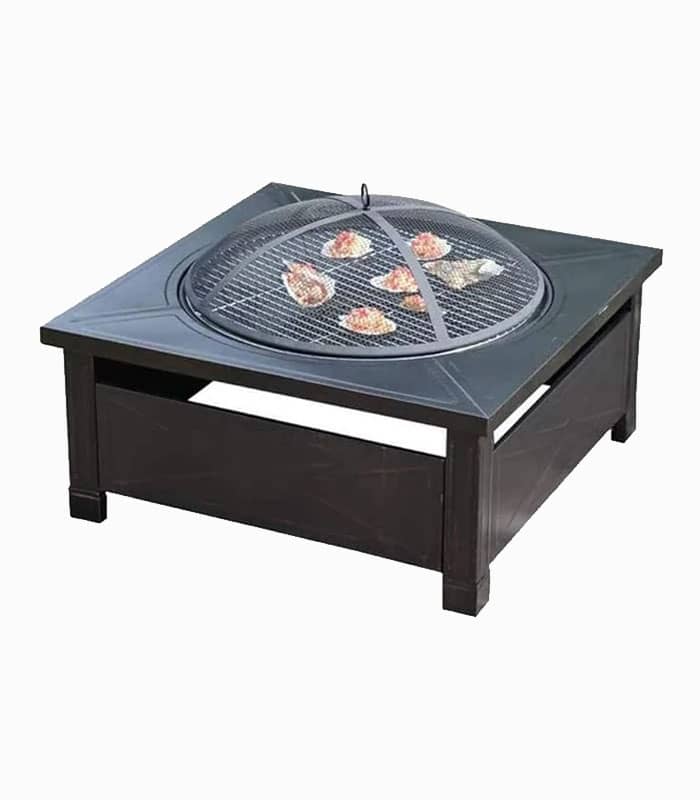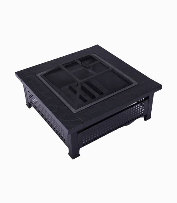 آتشدان چندکاره با طراحی مربعی و رنگ مشکی، مناسب استفاده به‌عنوان اجاق هیزمی، منقل ذغالی و میز باربیکیو در باغ، حیاط و فضای باز.