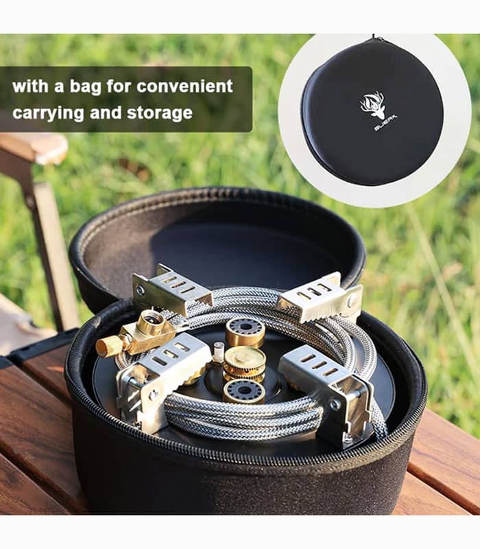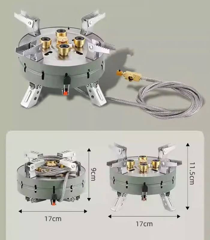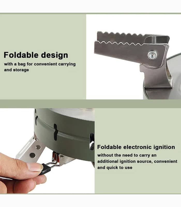 اجاق گاز کمپینگ تاشو با قدرت 13800 وات، سبک و قابل حمل با کیف مخصوص. دارای جرقهزن الکترونیکی و سه رابط گاز برای استفاده در شرایط مختلف.