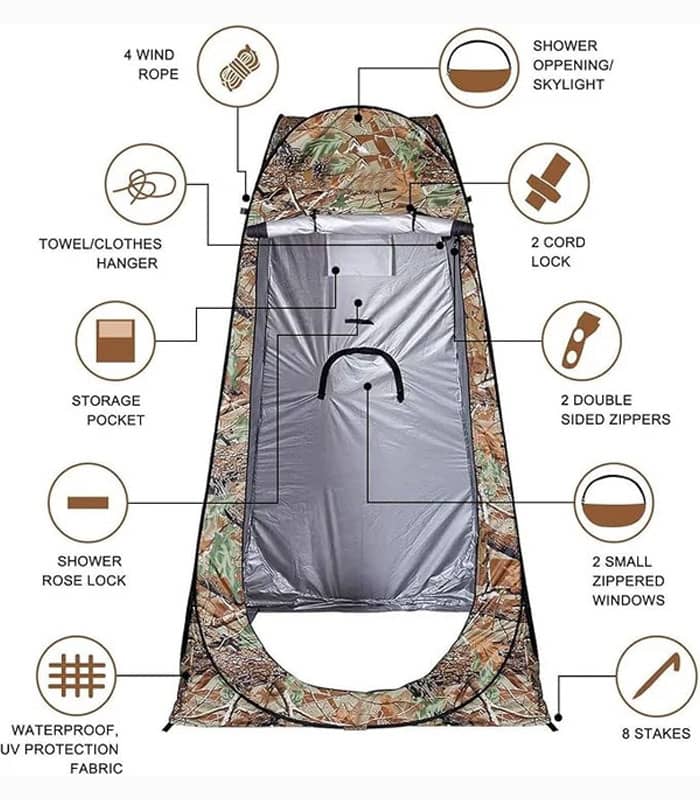 این چادر، همراهی کاربردی و ضروری برای هر سفر کمپینگ یا طبیعتگردی است که نیاز به حریم خصوصی و راحتی دارد.