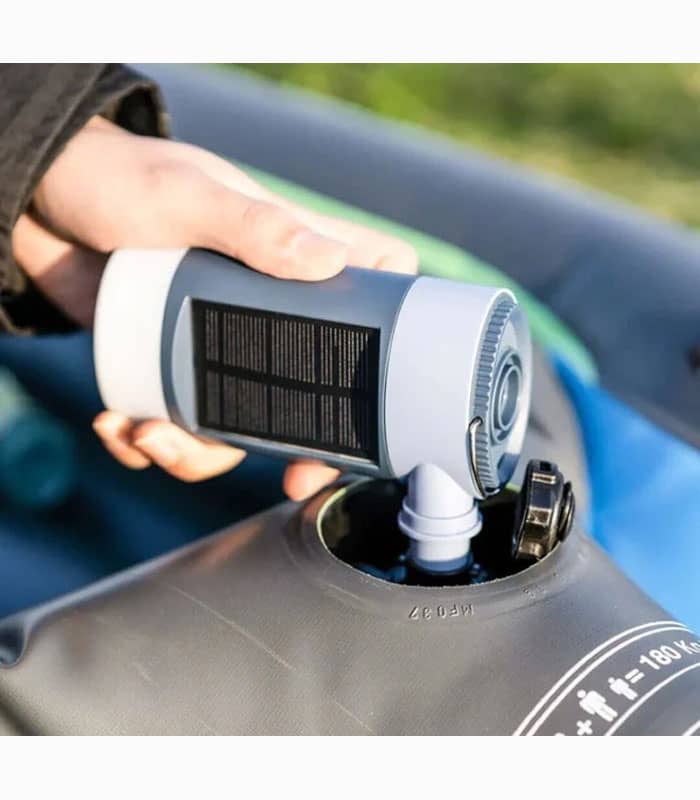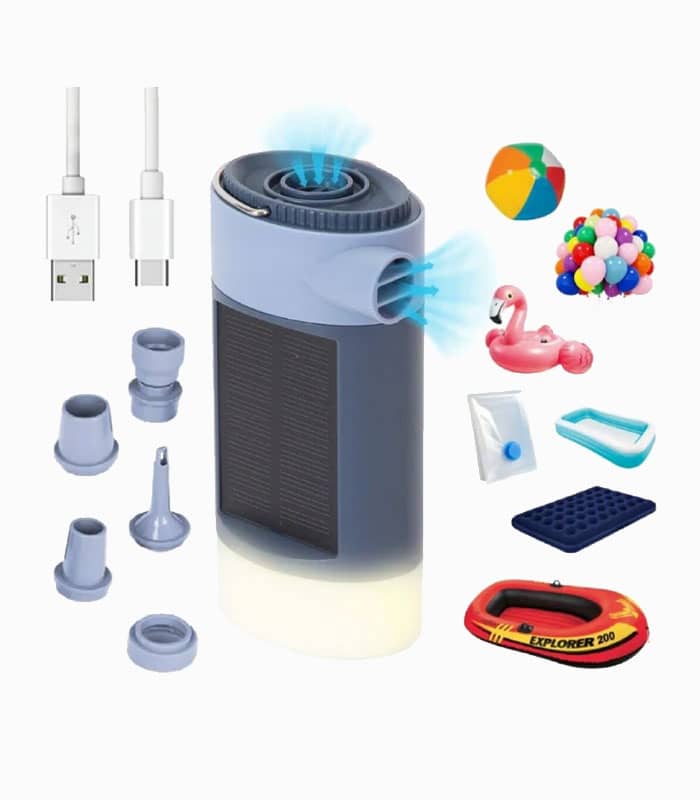 پمپ باد شارژی خورشیدی چندکاره با چراغ کمپینگ LED، پاوربانک و ۵ سری نازل. ضدآب، سبک، قابل شارژ با USB-C و انرژی خورشیدی. مناسب سفر، کمپینگ و استفاده روزمره.